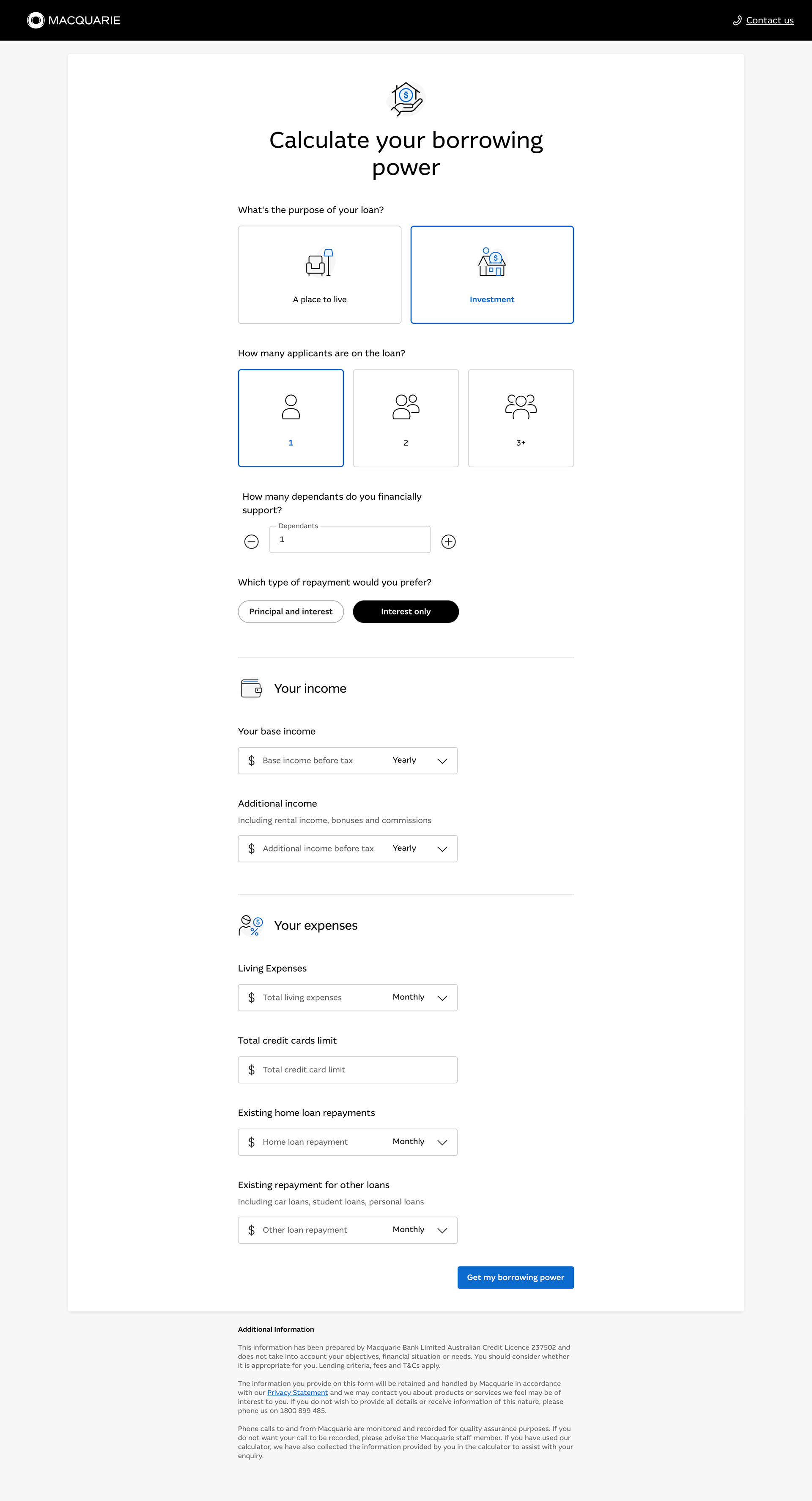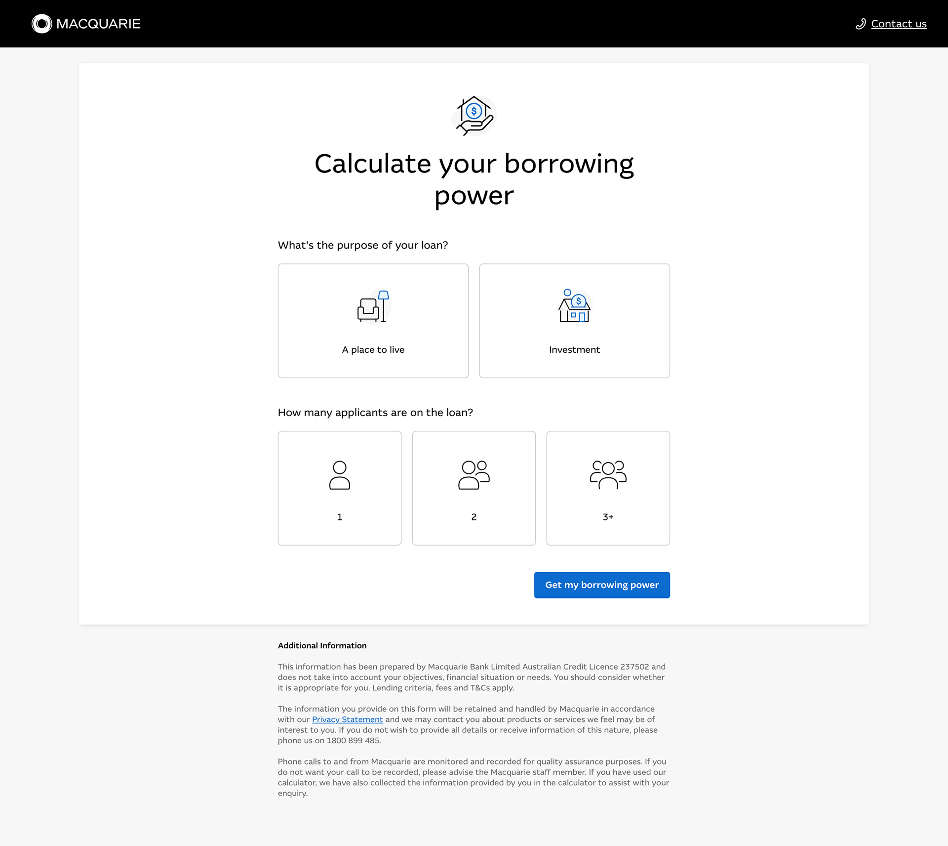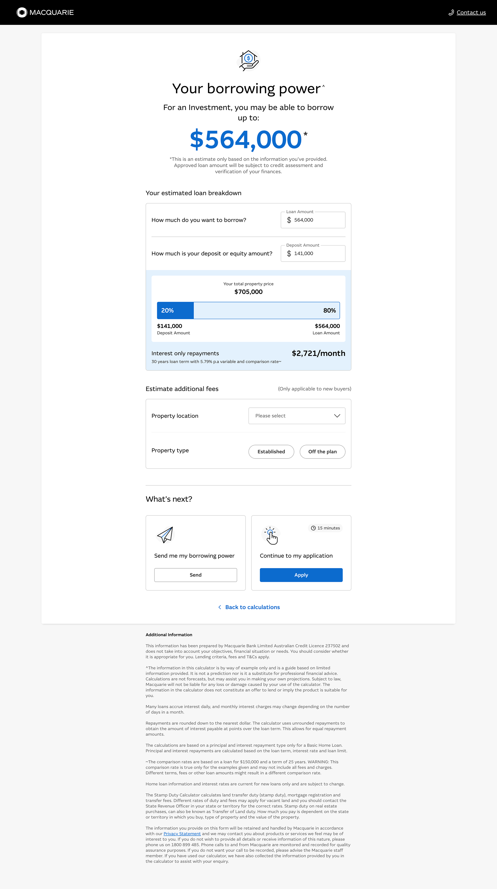 The calculator is accessible from our Home Loans page on the Macquarie website and provides an estimated borrowing capacity for applicants looking for a primary place or residence or investment property. Once a customer generates their borrowing capacity, they are empowered to apply for pre-approval or directly apply for their home loan with Macquarie.