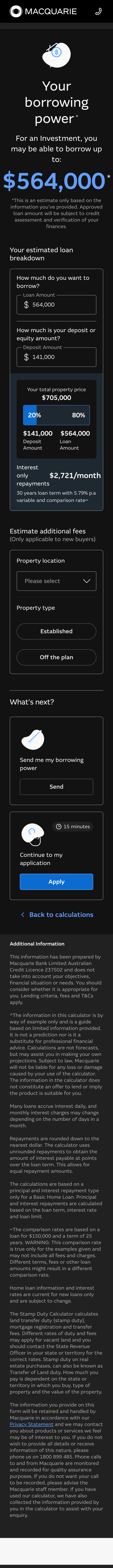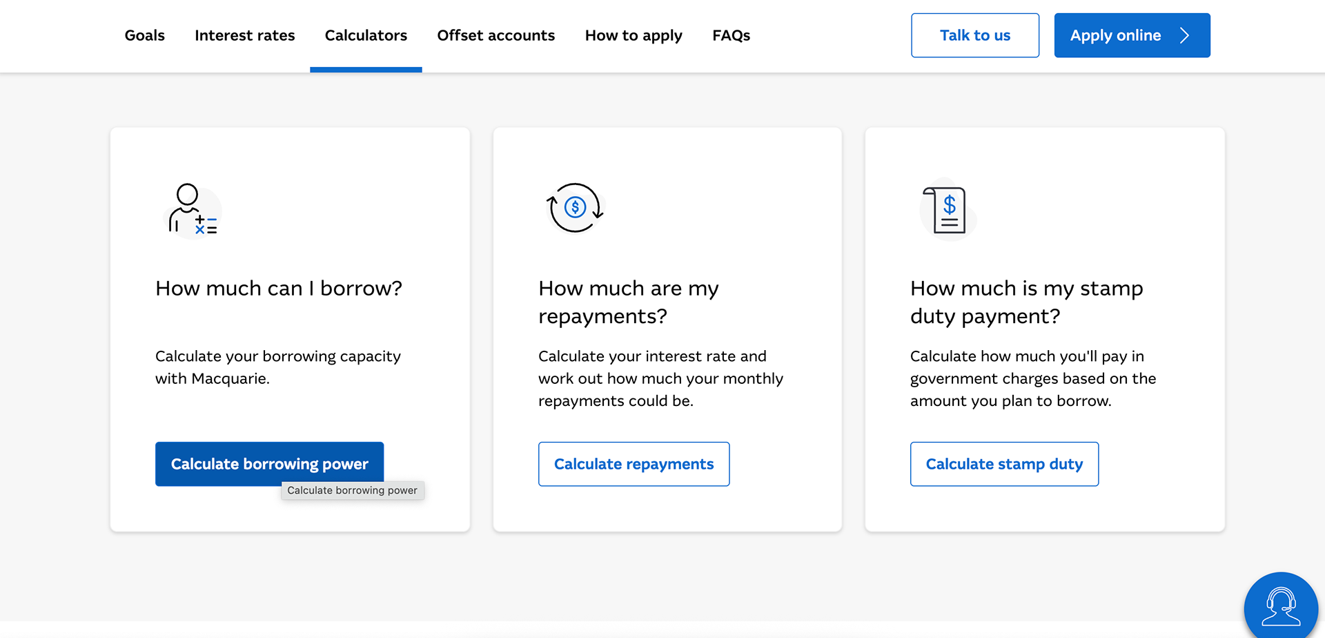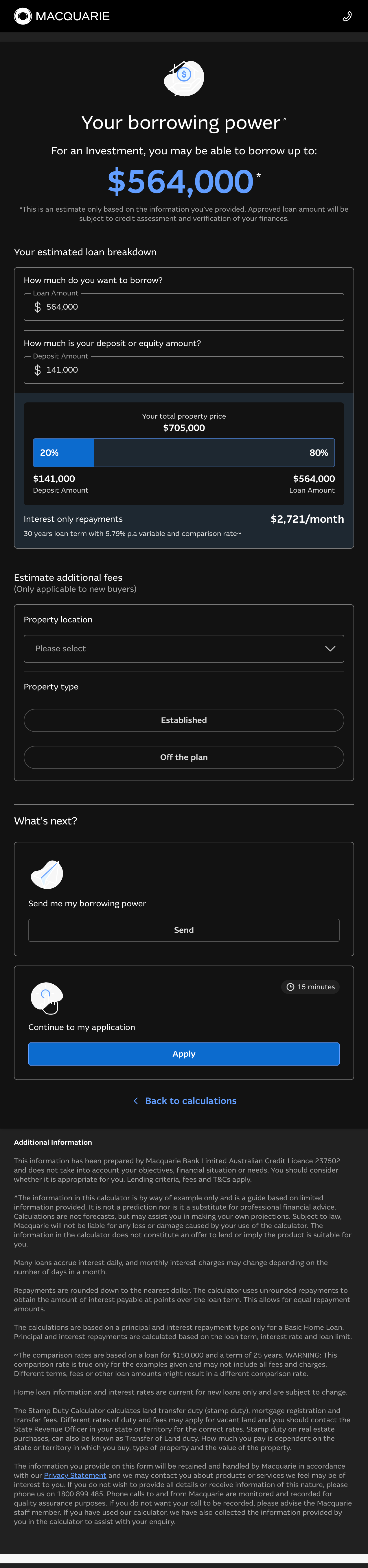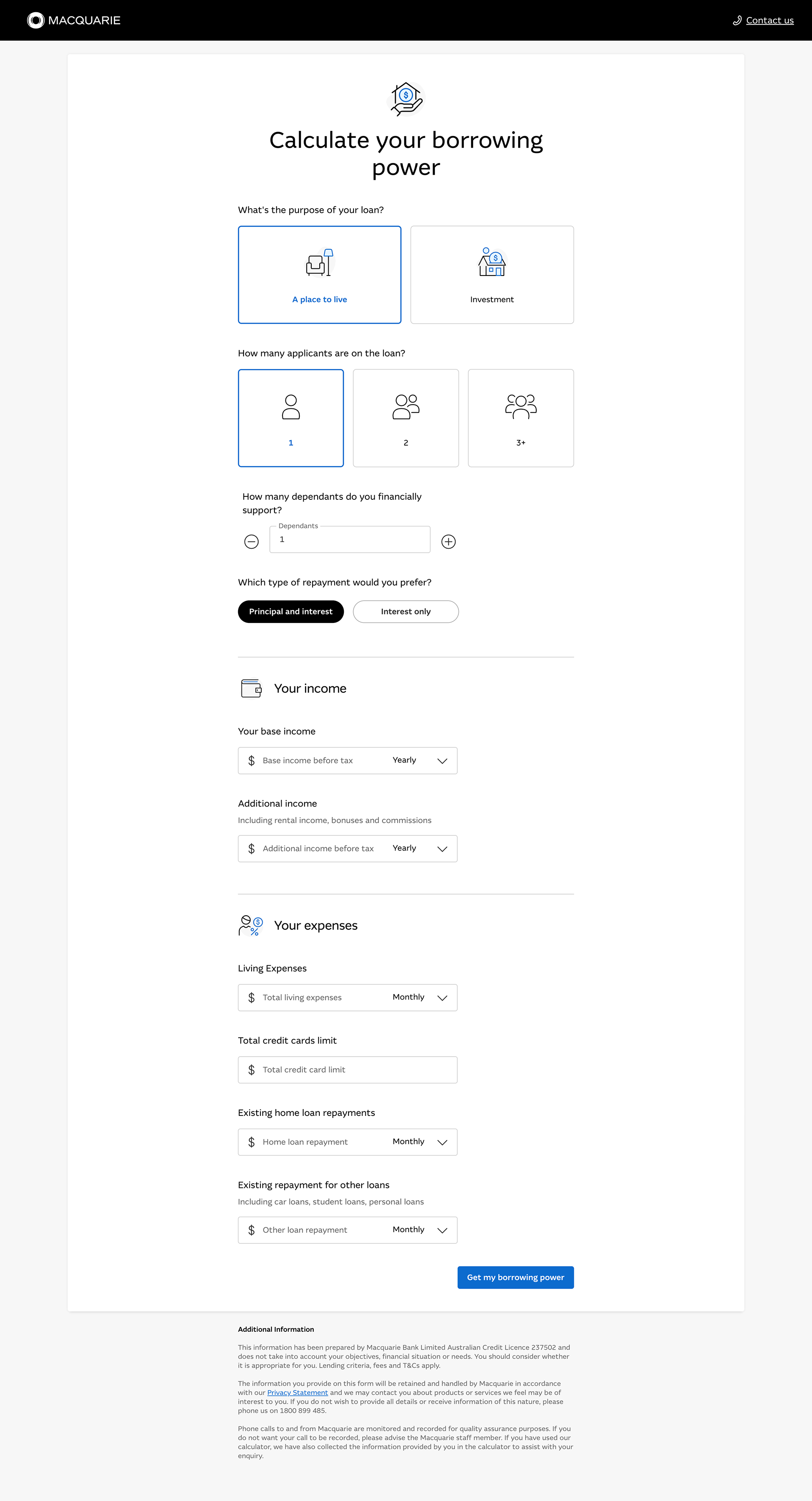 The calculator is accessible from our Home Loans page on the Macquarie website and provides an estimated borrowing capacity for applicants looking for a primary place or residence or investment property. Once a customer generates their borrowing capacity, they are empowered to apply for pre-approval or directly apply for their home loan with Macquarie.
