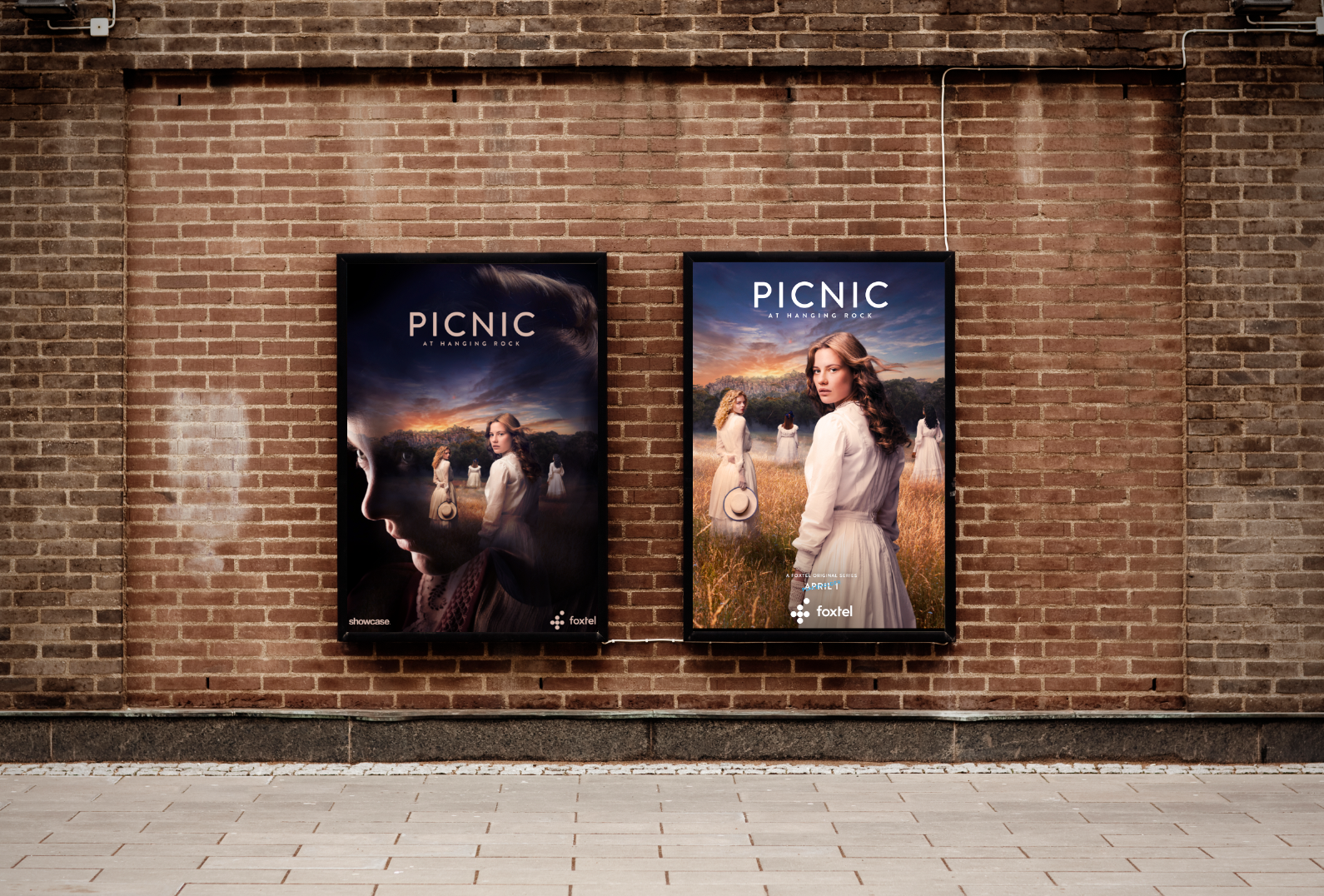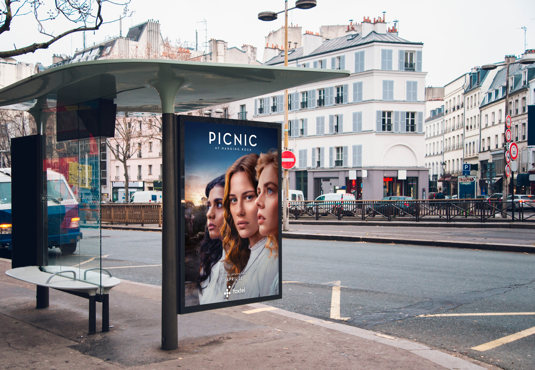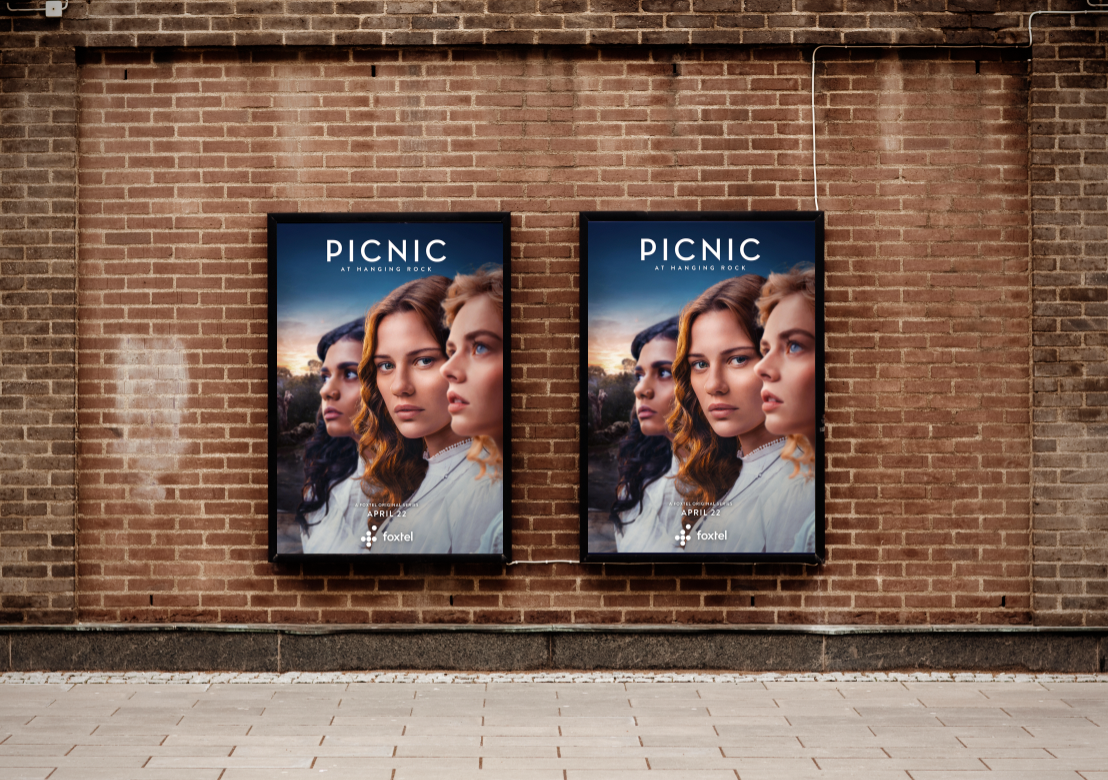 Through a process of reforming these ideas into a concept that both production and marketing team were happy with, we developed the concept of the three girls looking towards the hanging rock. Being up-close and personal, eye contact connects with the audience and passer-bye, to question the key art and ask what the girls are in awe of. We played with this idea using Lenticular screens, where the girls would disappear at certain angles when walking past, as well as digital screens in Westfields where the girls would spin across the screen to disappear into other characters or smoke. The final key art from the brief was stripped back even further, using a pink and blue sky to reflect the director’s intense use of colour and contrast in the re-make. This eye-catching key art is succinct at attractive attention and question to ultimately drive audience views.